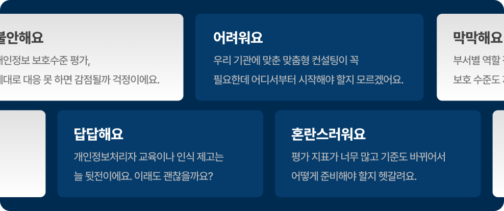 조직 내 민감정보 노출 여부를 정밀하게 진단하고, 법적 리스크를 최소화할 수 있도록 단계별 진단과 개선 컨설팅을 제공합니다.